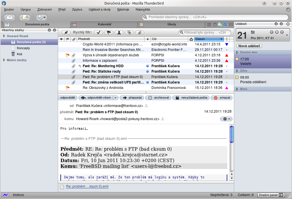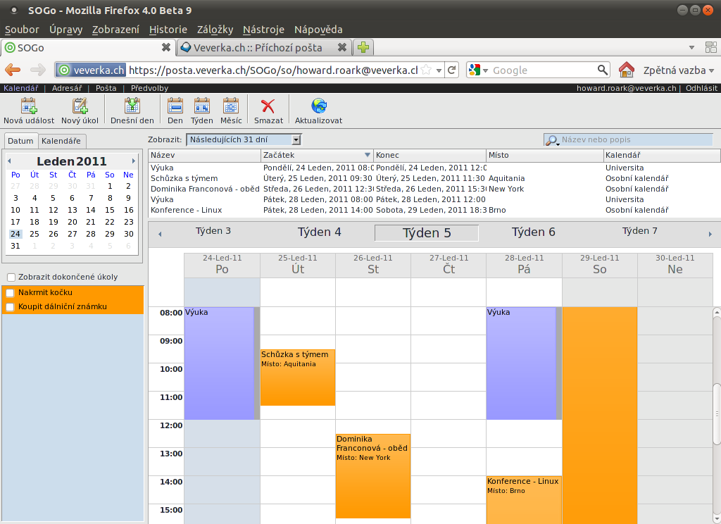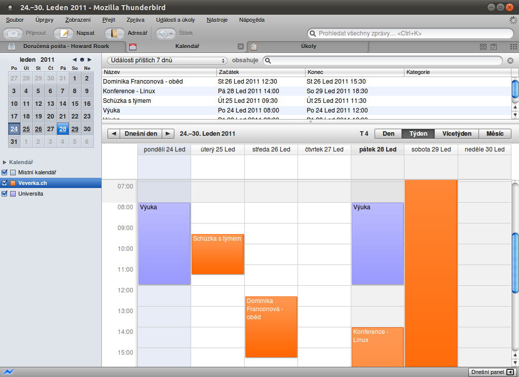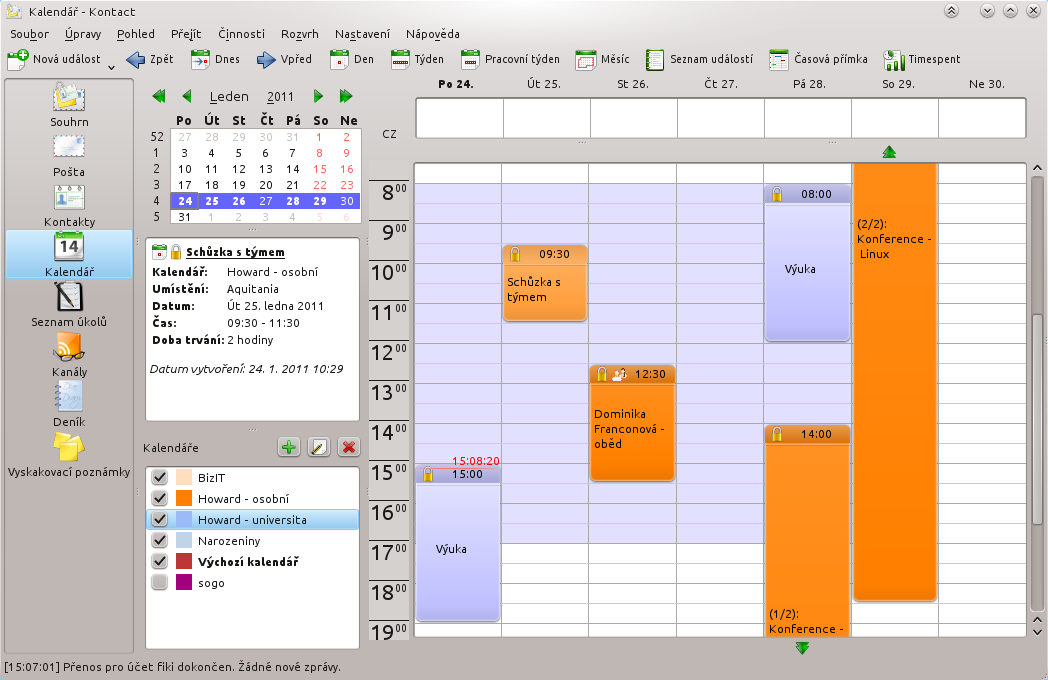 Svůj čas si můžete plánovat pomocí vestavěného kalendáře. K němu opět máte přístup jak z webového rozhraní, tak z klientských programů typu Thunderbird nebo KMail nebo z mobilního telefonu.