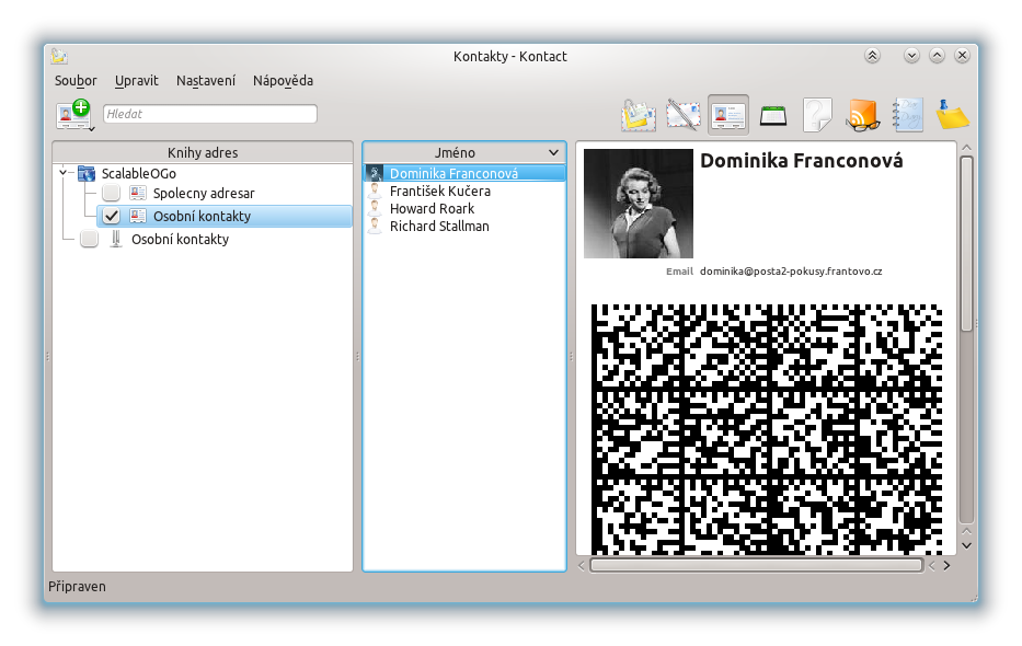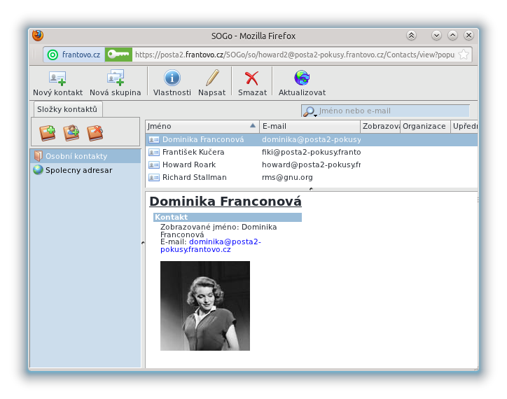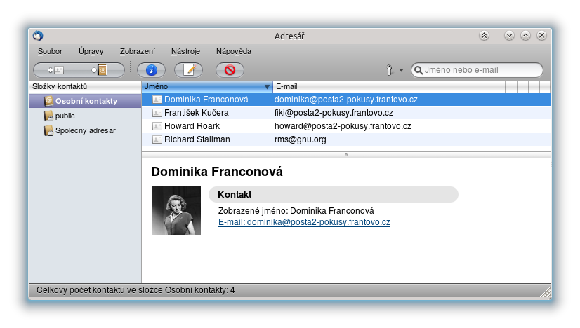 Každý uživatel má jeden nebo více (např. pracovní a osobní) adresářů, kam si ukládá své kontakty. Adresář je uložen na serveru a máte k němu přístup jak přes webové rozhraní, tak přes desktopové programy, jako Thunderbird nebo Kontact: