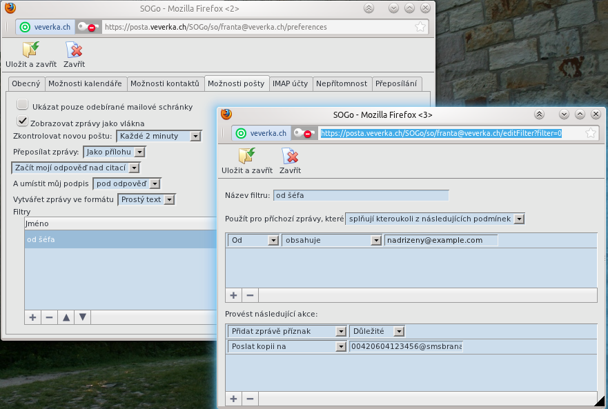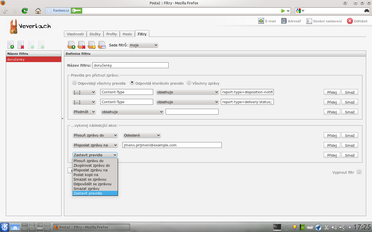 Automatické filtry nám pomůžou efektivně zvládnout velké objemy příchozí pošty. Filtry za nás na základě stanovených pravidel roztřídí zprávy do složek, označí nebo odešle jinam. Zprávy také můžeme nasměrovat do programu/skriptu, který je zpracuje (načte jejich obsah a následně provede nějakou akci, např. uloží hodnoty z e-mailu do databáze).