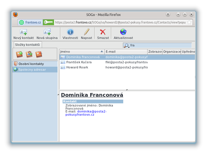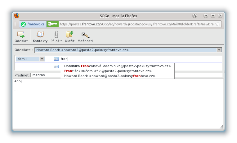 Vedle uživatelských adresářů máme ještě jeden adresář společný pro celou firmu – automaticky jsou v něm všichni uživatelé. Při psaní nové zprávy stačí zadat pár znaků jména nebo adresy příjemce a systém nabídne možné příjemce podle globálního adresáře.